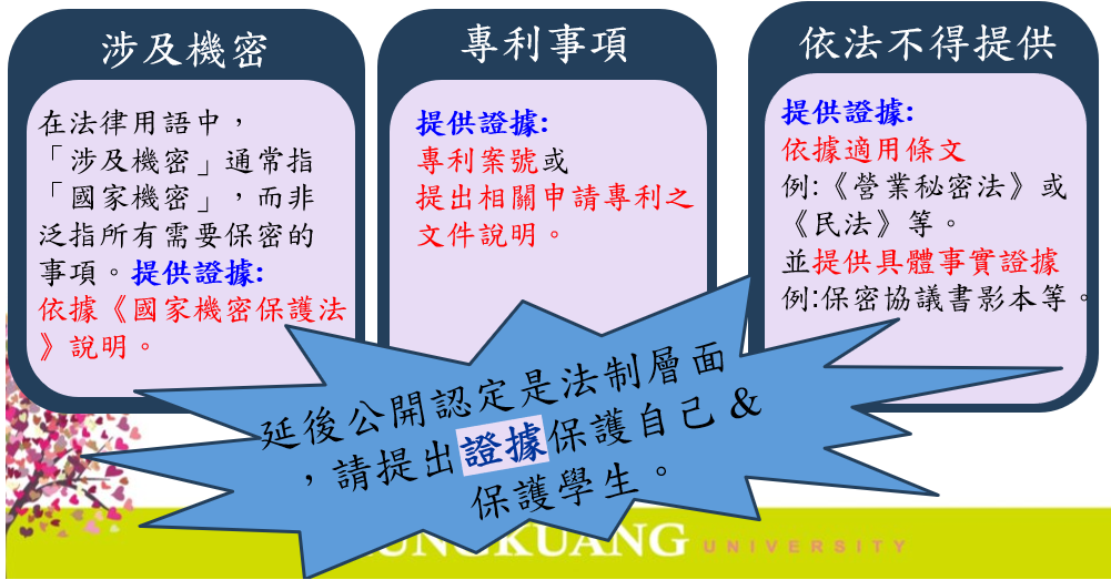 ★弘光科技大學研究生博士暨碩士學位考試辦法(進入本校法規詳閱全文)★>第17條>學位論文(含電子全文)以公開為原則,但涉及機密、專利事項或依法不得提供,且應檢附證明文件,於學位考試前提出申請論文延後公開,並於學位考試時由考試委員審核確認,其延後公開申請書應經指導教授、考試委員、系主任、院長及教務長認定,方可不予提供或於一定期間內不為提供。
