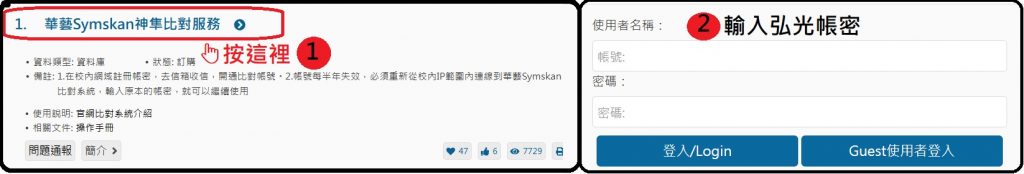 帳號半年到期後,無需重新註冊,只需在校內IP範圍(按照下圖步驟1~步驟2~)連線到「華藝Symskan文獻相似度檢測服務」,並使用原帳號密碼登入,即可自動續期180天。