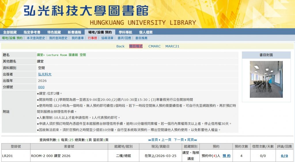| 借用方式: ▲網路預約:講堂預約(進入網站) 1.使用時間以2小時為一個時段,無人預約即可續借1個時段,可自行先至網路預約,再於預訂時間到服務台辦理借用手續。 2.申請人須於預訂時間內憑證件至圖書館服務台辦理借用手續,逾時10分鐘視同棄權。若一個月內棄權兩次以上者,停止借用權30天。 3.因故無法前來,須於您預約之時間至少提前10分鐘,自行至系統取消預約,釋出空間讓他人預約使用,以免影響他人權益。 – |