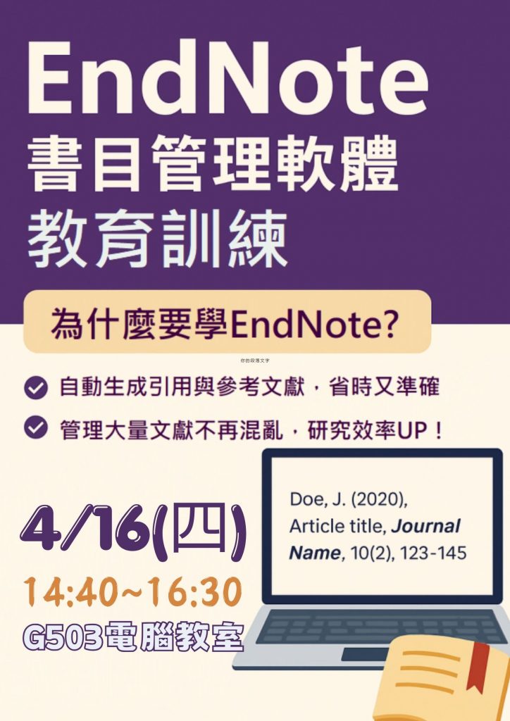 📢EndNote書目管理軟體教育訓練,4/16(四)在G503電腦教室,快來報名!