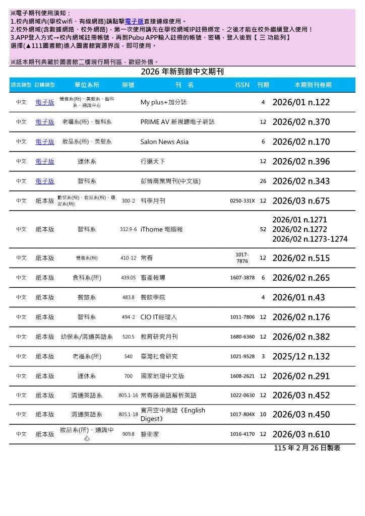 02-03月份新上架期刊資訊如下連結,歡迎您線上使用或到圖書館借閱!