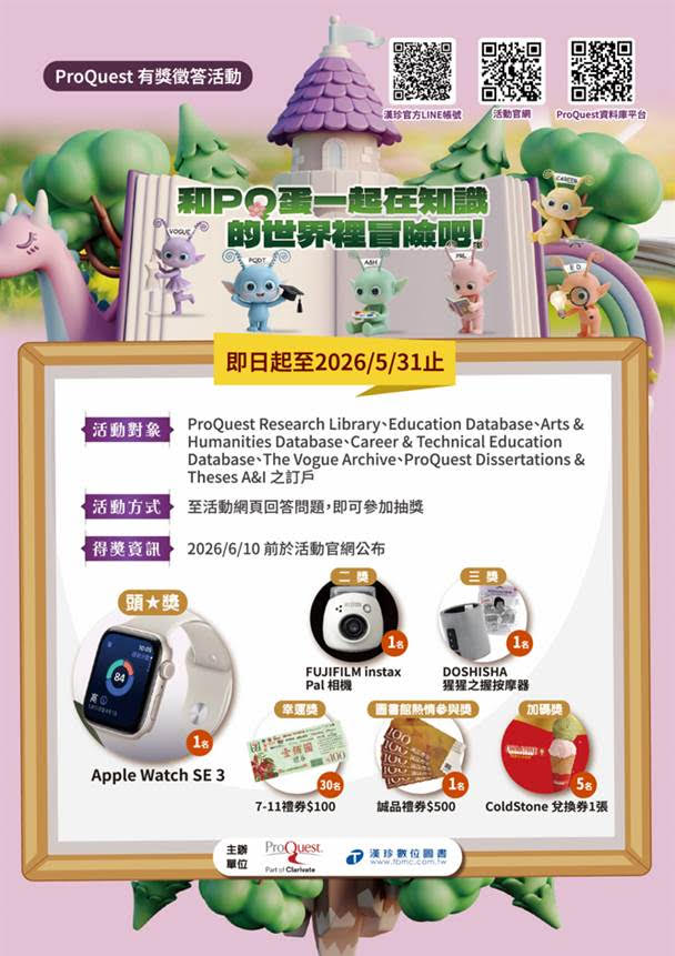 活動網站👉https://www.tbmc.com.tw/event/PQ2026/ 👇本校 「ProQuest 」平台線上資源: 1.Education Database教育研究資料庫 2.The Vogue Archive 3.ProQuest One Applied & Life Science應用與生命科學全文資料庫 4.(PQTD)ProQuest Dissertations & Theses A&I美加地區數位化學位論文摘要